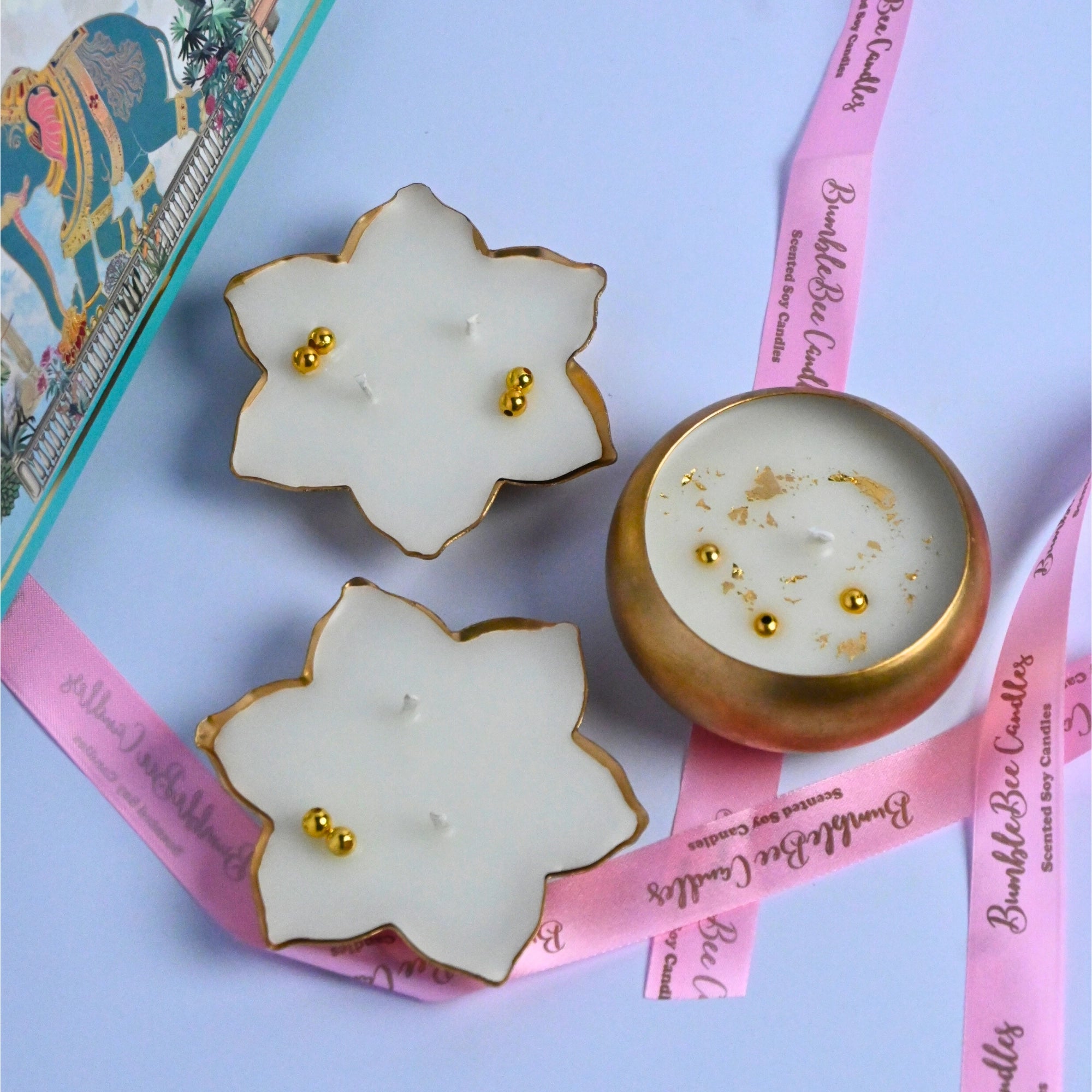 This luxurious scented soy candle gift set is the perfect return favour for weddings, Haldi ceremonies, and elegant celebrations. Infused with the timeless Royal Rose fragrance, the set features three beautifully crafted urlis. The golden round urli measures 3 inches in diameter and holds 80 grams of soy wax, offering a rich, soothing burn. It is paired with two flower-shaped urlis, each measuring 3.5 inches in diameter and holding 45 grams of wax, adding charm and symmetry to the set. Presented in a premium gold-foiled gift box sized 7.9 x 5.3 x 1.4 inches, this set delivers sophistication and memorable gifting appeal.