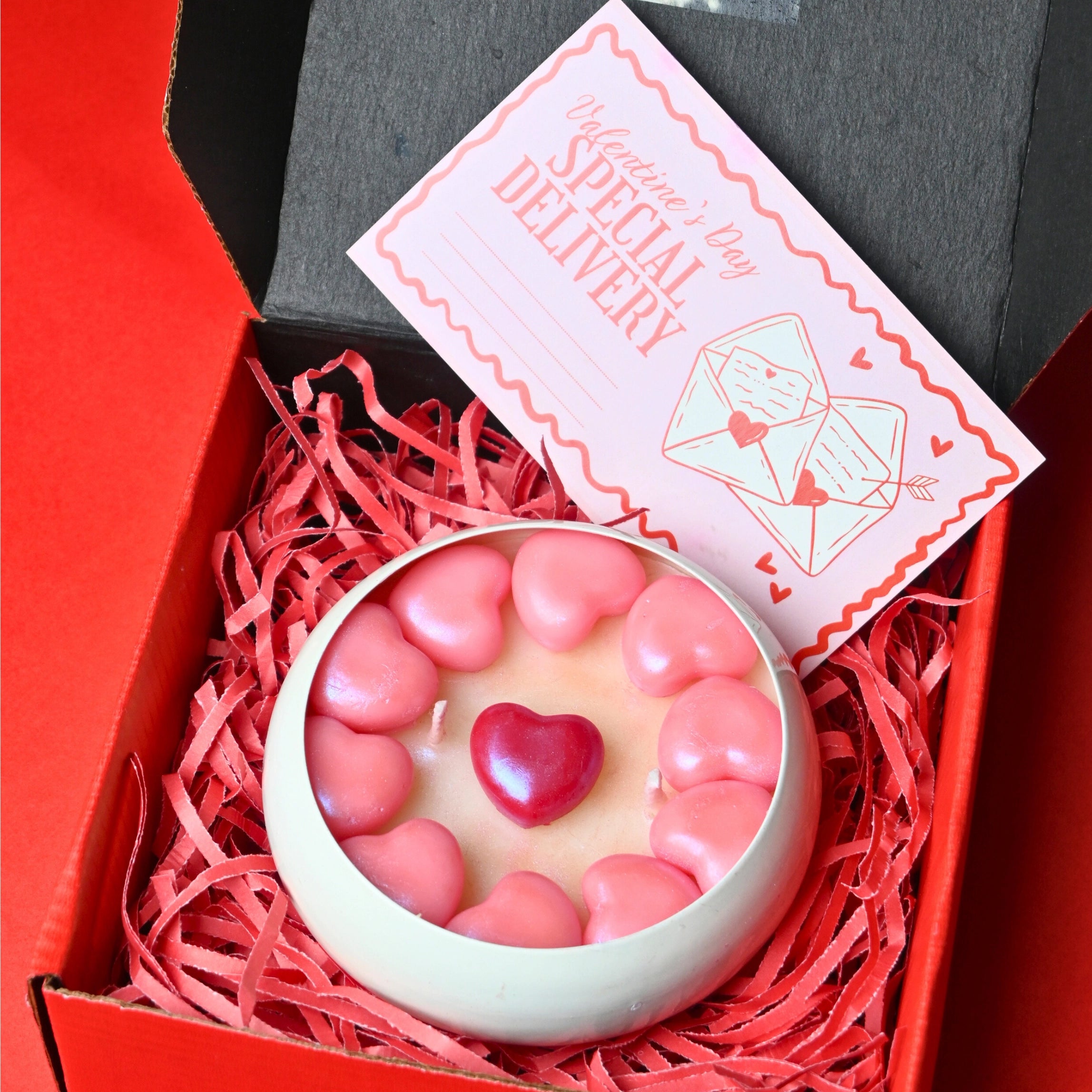 Crafted to celebrate love in its most beautiful form, this handcrafted soy wax candle is poured into a charming 4-inch wooden bowl and designed to make Valentine’s Day extra special. Made with 100% natural soy wax, it features a premium, multi-layered fragrance blend that unfolds softly and lingers with warmth and elegance. Weighing approximately 200 grams, the candle burns clean and evenly, creating an intimate, romantic ambiance. Thoughtfully presented in an elegant red box and paired with a Valentine’s card, it makes for a meaningful gift that speaks of care, affection, and quiet luxury, perfect for gifting someone special or setting the mood for a memorable evening.