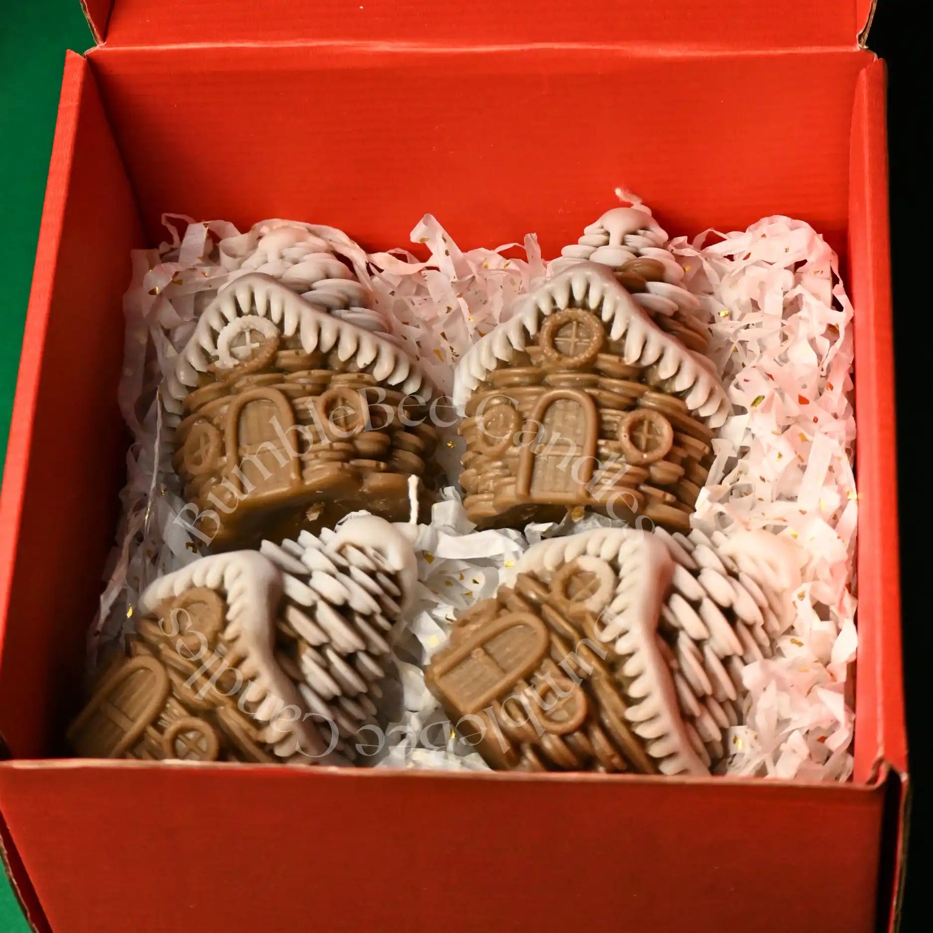 Bring the magic of Christmas home with our Set of 4 Gingerbread House Candles, beautifully packed in a festive “’Tis the Season” gift box (7 × 7 × 4 inches). Each candle is hand-poured with premium wax and infused with a refreshing Forest Pine fragrance that evokes the aroma of winter forests and cozy holiday evenings. With a wax weight of 120 g each and dimensions of 8.5 × 6.7 cm, these detailed gingerbread house candles make a charming addition to your Christmas décor or gifting. Perfect for table styling, festive hampers, Secret Santa, and holiday celebrations.
