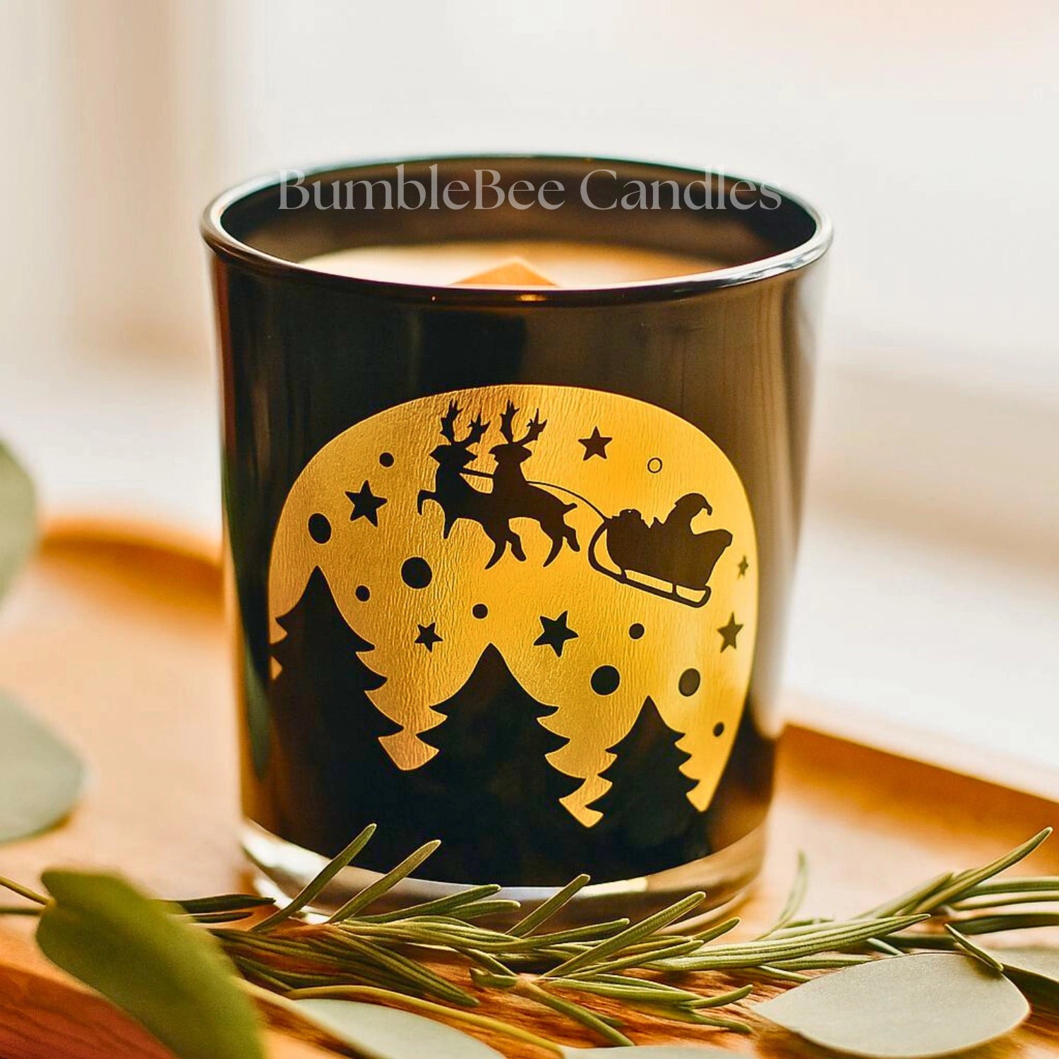 This elegant Christmas jar candle is hand-poured with 200 grams of pure soy wax and features a natural wooden wick that burns with a soothing, crackling sound. The fragrance, Coco Butter, wraps your space in warm, creamy, chocolatey notes that feel indulgent and comforting for the holiday season. The glossy black jar is adorned with a stunning gold silhouette of Santa’s sleigh and reindeer, making it a perfect festive décor accent. Whether you’re gifting or elevating your own Christmas ambience, this candle brings together luxury, warmth, and nostalgic holiday magic in one beautifully crafted piece.