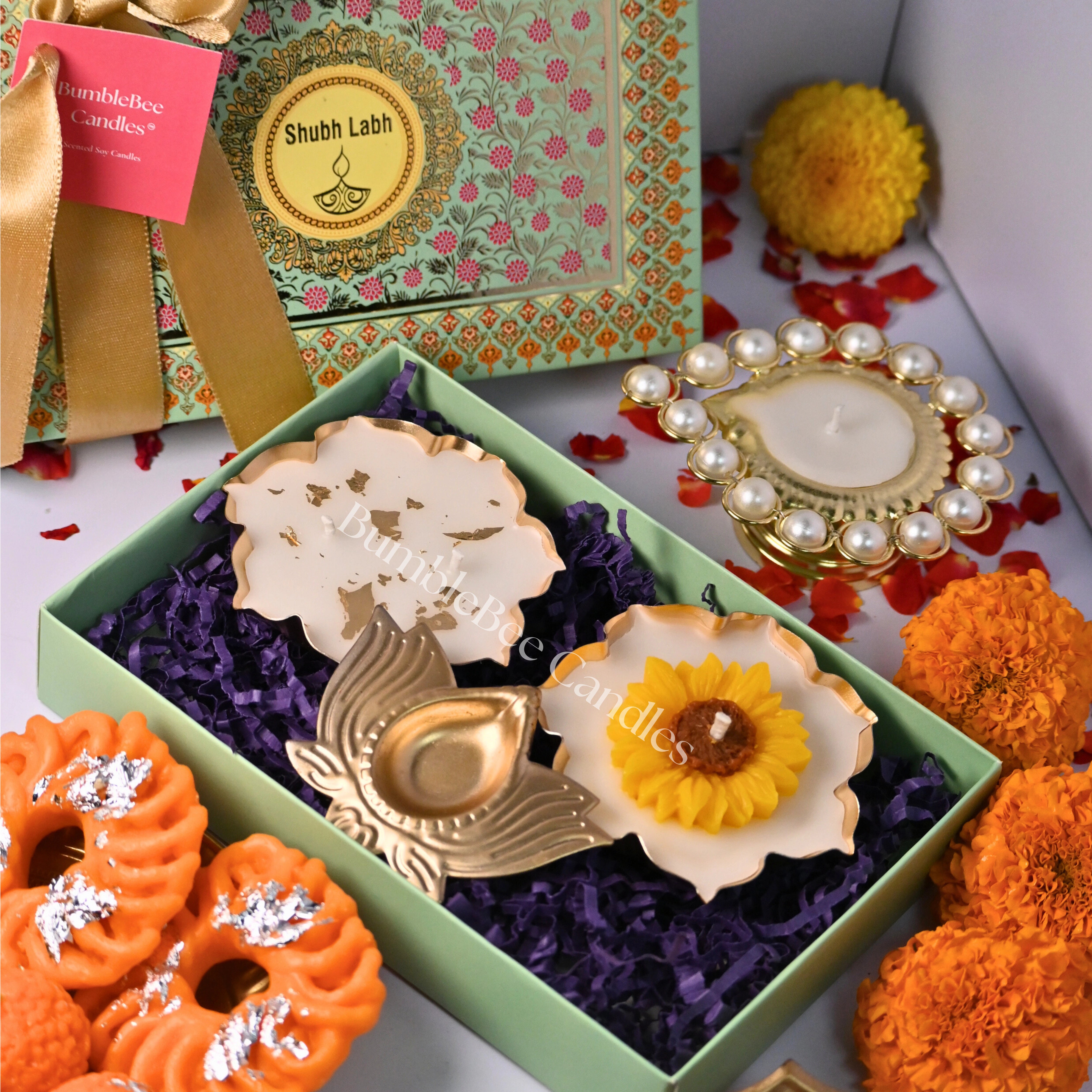 This hamper comes beautifully nestled in a festive-themed box sized 7.9" x 5.3" x 1.4". Inside, you’ll discover two elegant 3.5-inch Lotus Urlis, each thoughtfully filled with 55 g of soy wax, plus a gleaming metal diya to complete the set. Each piece radiates warmth and artisanal charm, making every moment feel celebratory and special. Whether adorning your décor or given as a heartfelt gift, this hamper brings a perfect balance of tradition and elegance—designed to elevate any festive moment with light and grace.