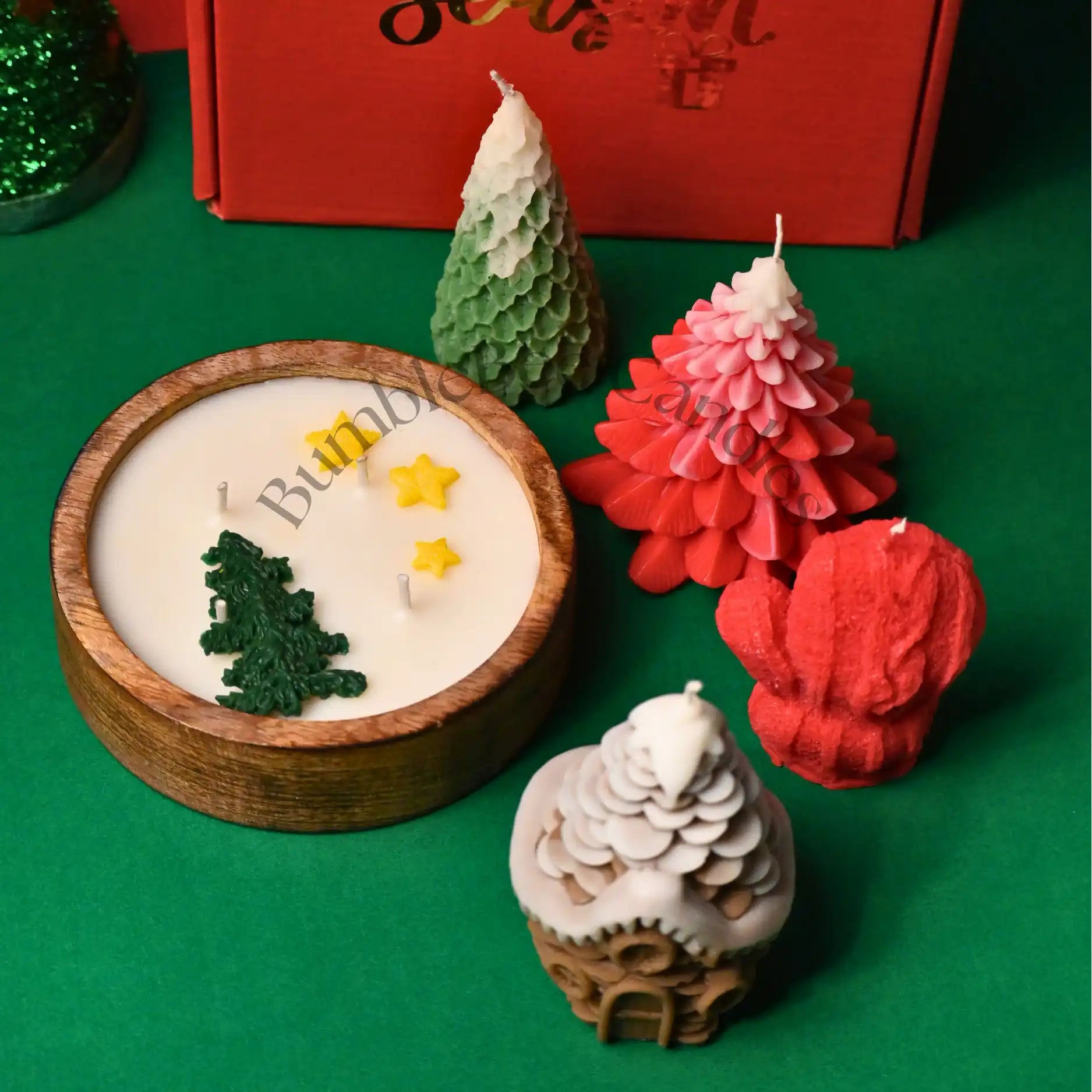 Celebrate the joy of Christmas with our “’Tis the Season” Premium Gift Box (7 × 7 × 4 inches), featuring a charming collection of 5 handcrafted festive candles. This set includes a Round Wooden Winter Night Bowl (125 g, Forest Pine, 5" diameter), a Mitten Candle (55 g, Vanilla, 7 × 4 cm), a Big Christmas Tree Candle (105 g, Forestwood, 11 × 8 cm), a Small Fir Tree Candle (50 g, Forestwood, 9 × 5 cm), and a Gingerbread House Candle (120 g, Pine Forest, 8.5 × 6.7 cm). Each candle is hand-poured with premium wax and festive fragrances that evoke winter nights, cozy warmth, and Christmas cheer. A heartwarming gift for décor lovers and holiday celebrations.
