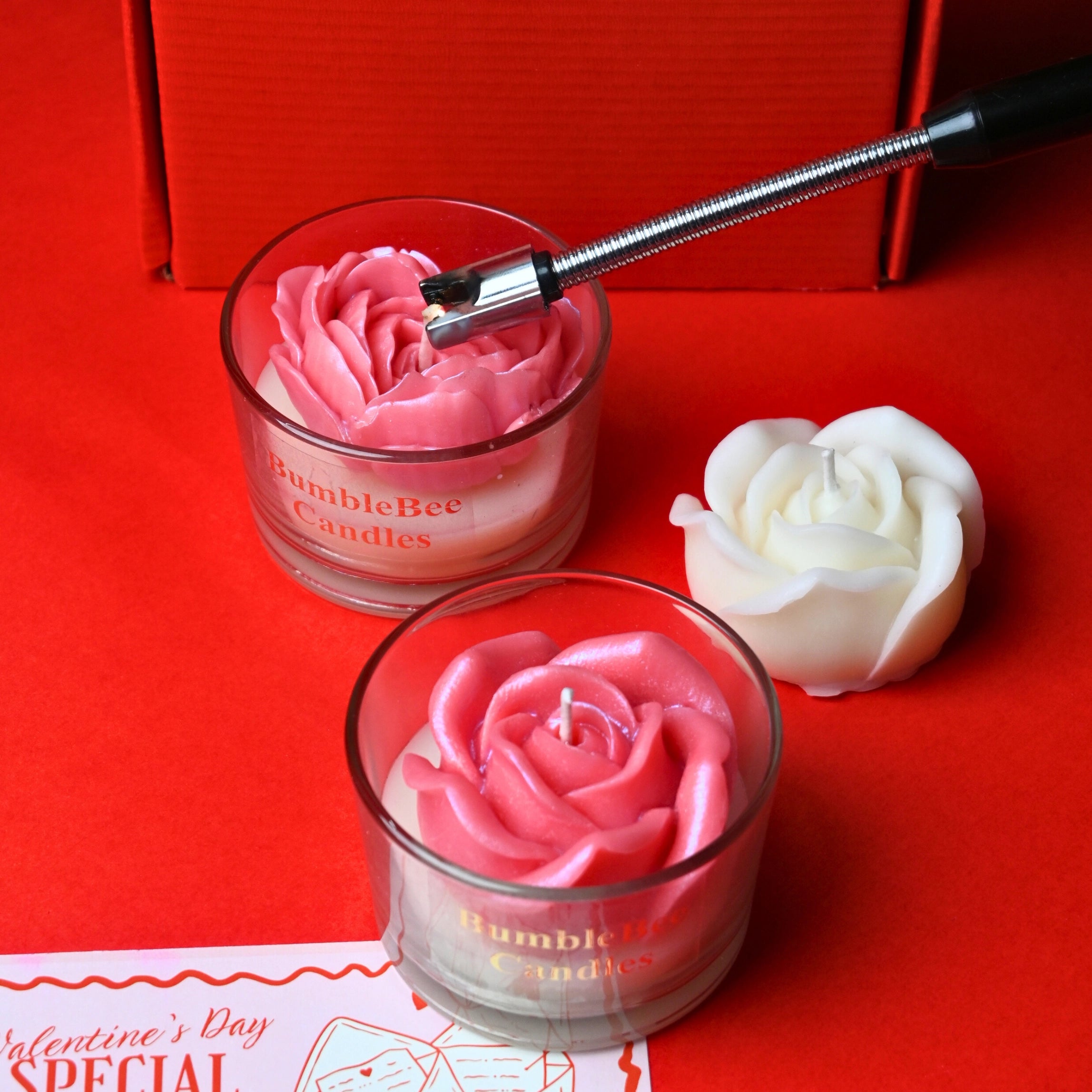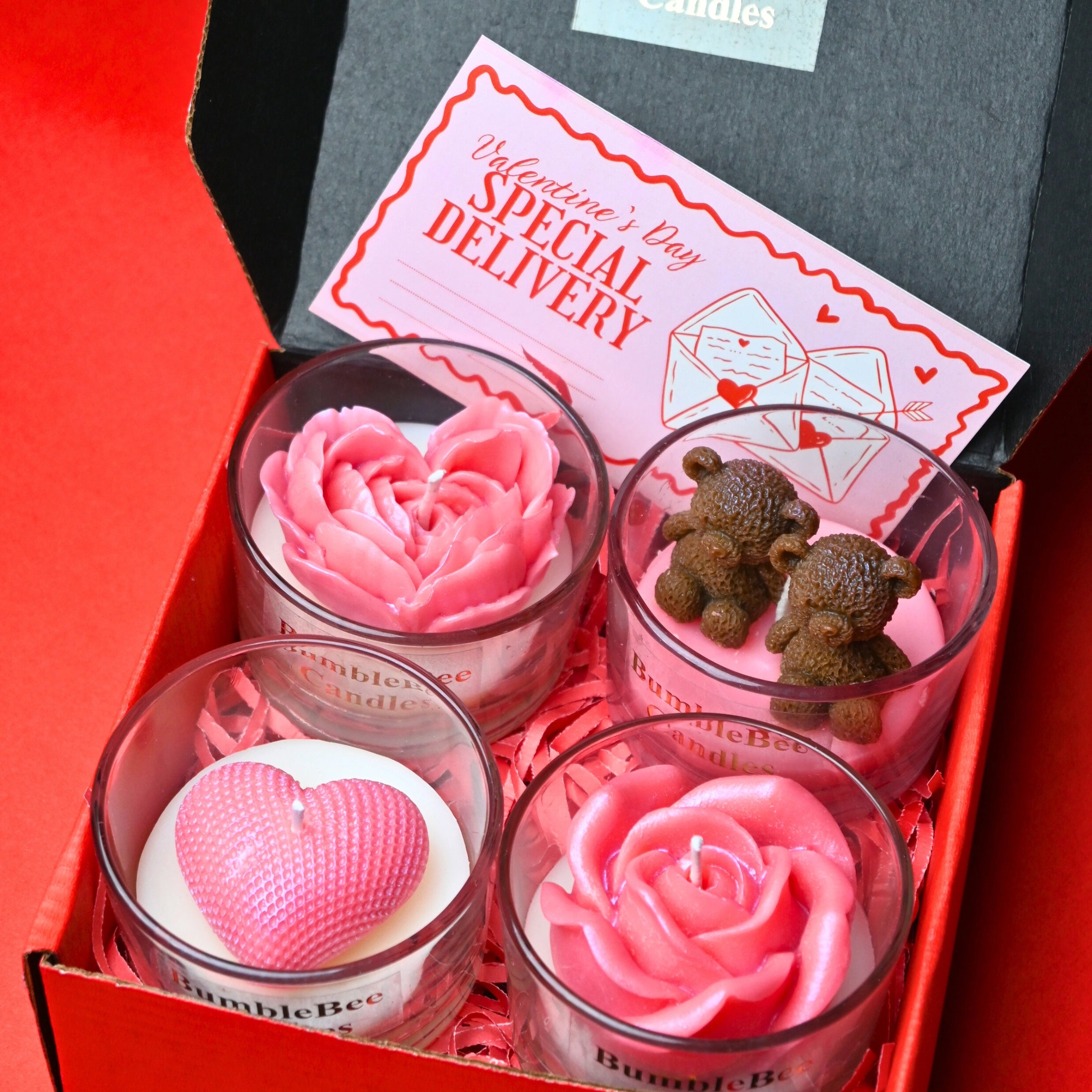 Celebrate love with this thoughtfully curated set of four love-themed jar candles, designed to make Valentine’s Day truly special. Featuring charming heart, rose, and teddy-shaped candle designs, this set captures romance, warmth, and affection in every detail. Hand-poured using 100% natural soy wax, each candle weighs approximately 130 grams and is crafted in jars measuring 3 inches in width and 2.5 inches in height. Infused with a soft blend of vanilla and floral notes, the candles create a comforting yet elegant fragrance experience. Beautifully packed in a premium hamper box and paired with a Valentine’s card, this set makes a heartfelt and timeless gift for your valentine.